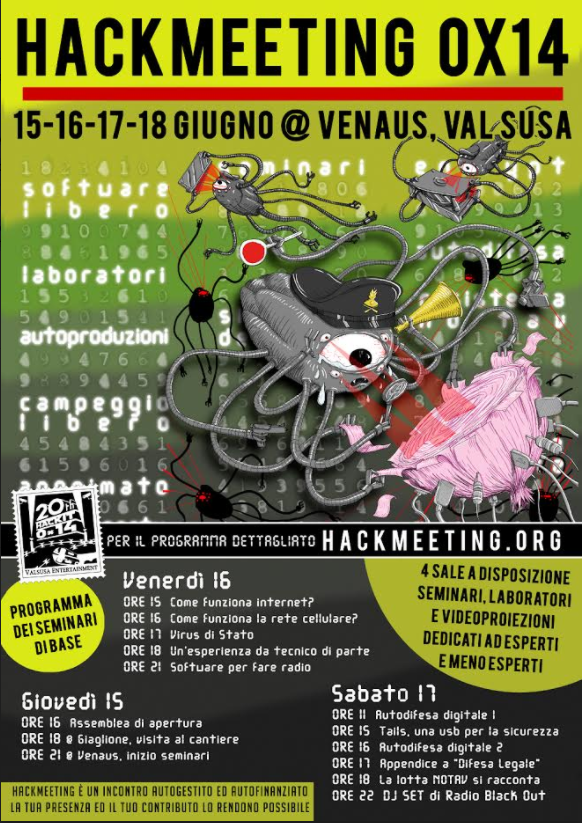 A comunidade hacker italiana organiza todos os anos o encontro nacional. O encontro è totalmente autorganizado, e circula em cidades de todo pais a 20 anos. Esse ano o encontro acontece na Val Susa, num dos presidio de resistencia mais importantes do movimento NOTAV, que contesta e resiste a ocupação e destruição do terrítorio por parte das grande obras.